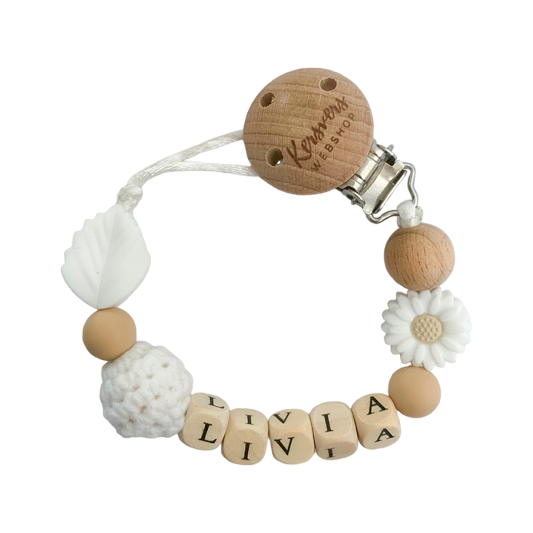 Met deze leuke speenkoorden raak je nooit meer speentjes kwijt. Voeg de gewenste naam toe en bestel hem direct Het speenkoord wordt altijd geleverd in een mooi wit organza zakje, waardoor het er mooi uitziet wanneer je hem cadeau wilt doen.